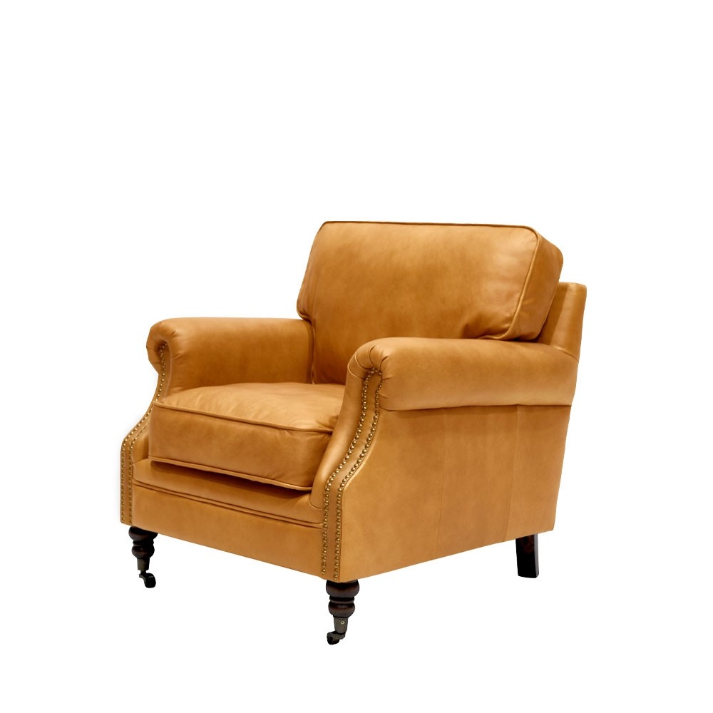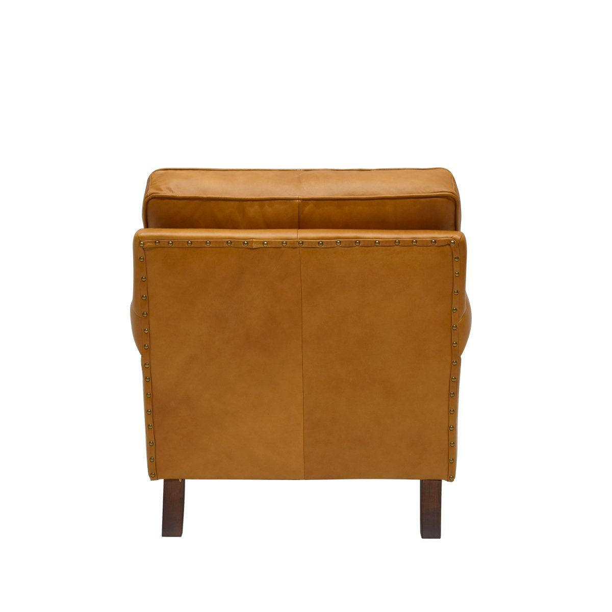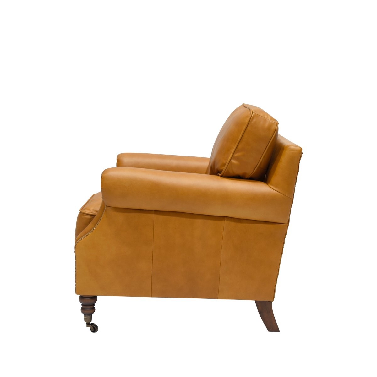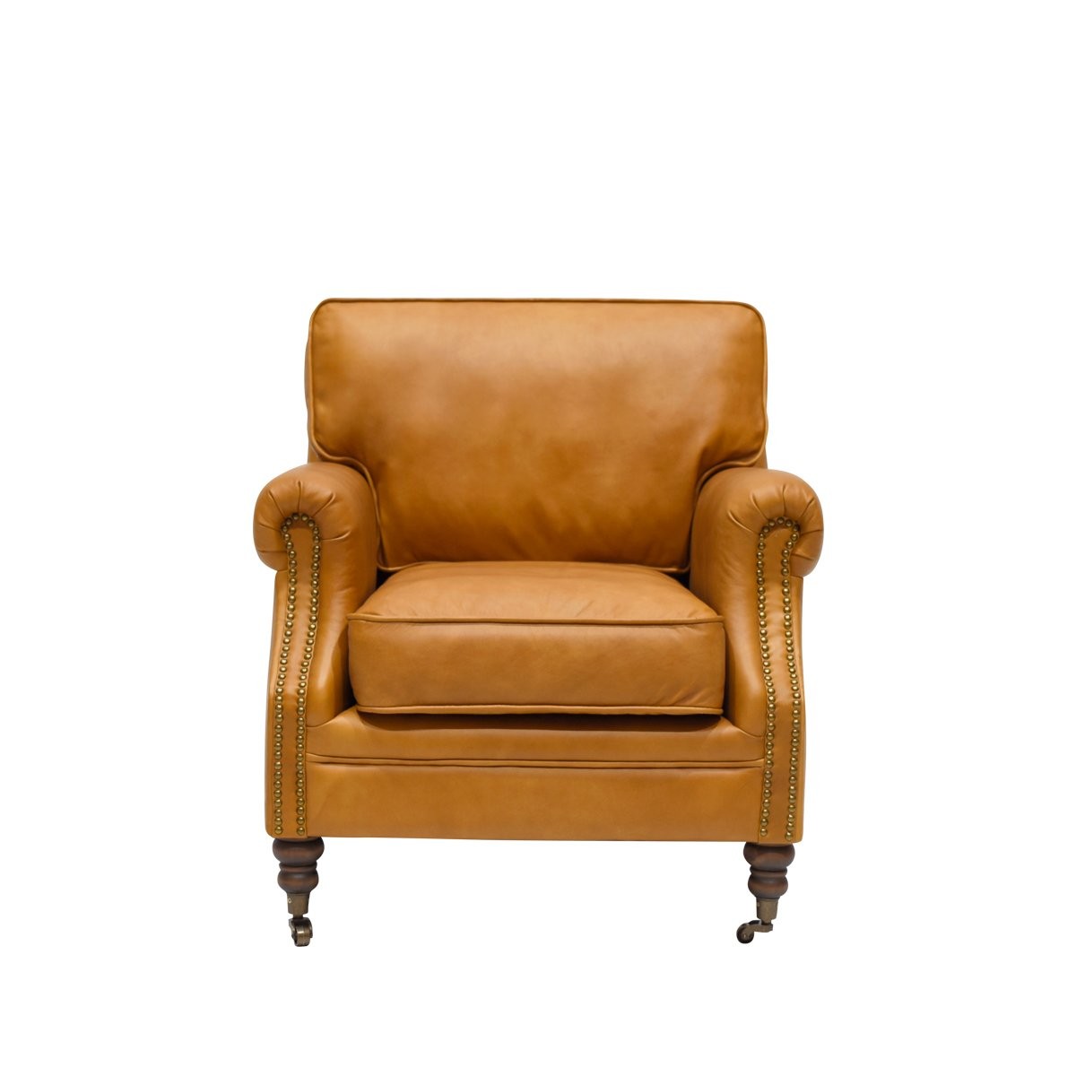 Pleated roll arms outlined with antique-bronze studs define its signature profile, the classic Chestnut coloured leather upholstery of this timeless design will complement most existing decor, and bring with it ample style and class.