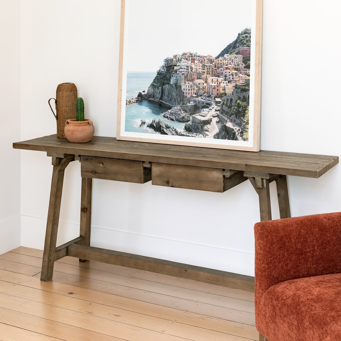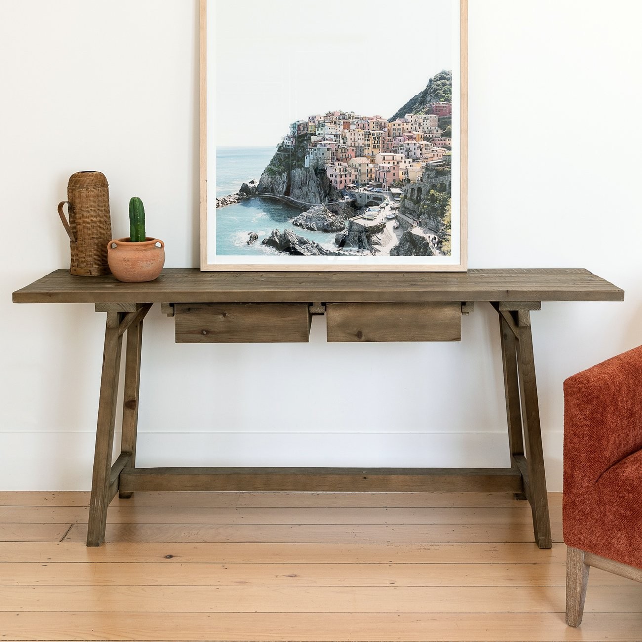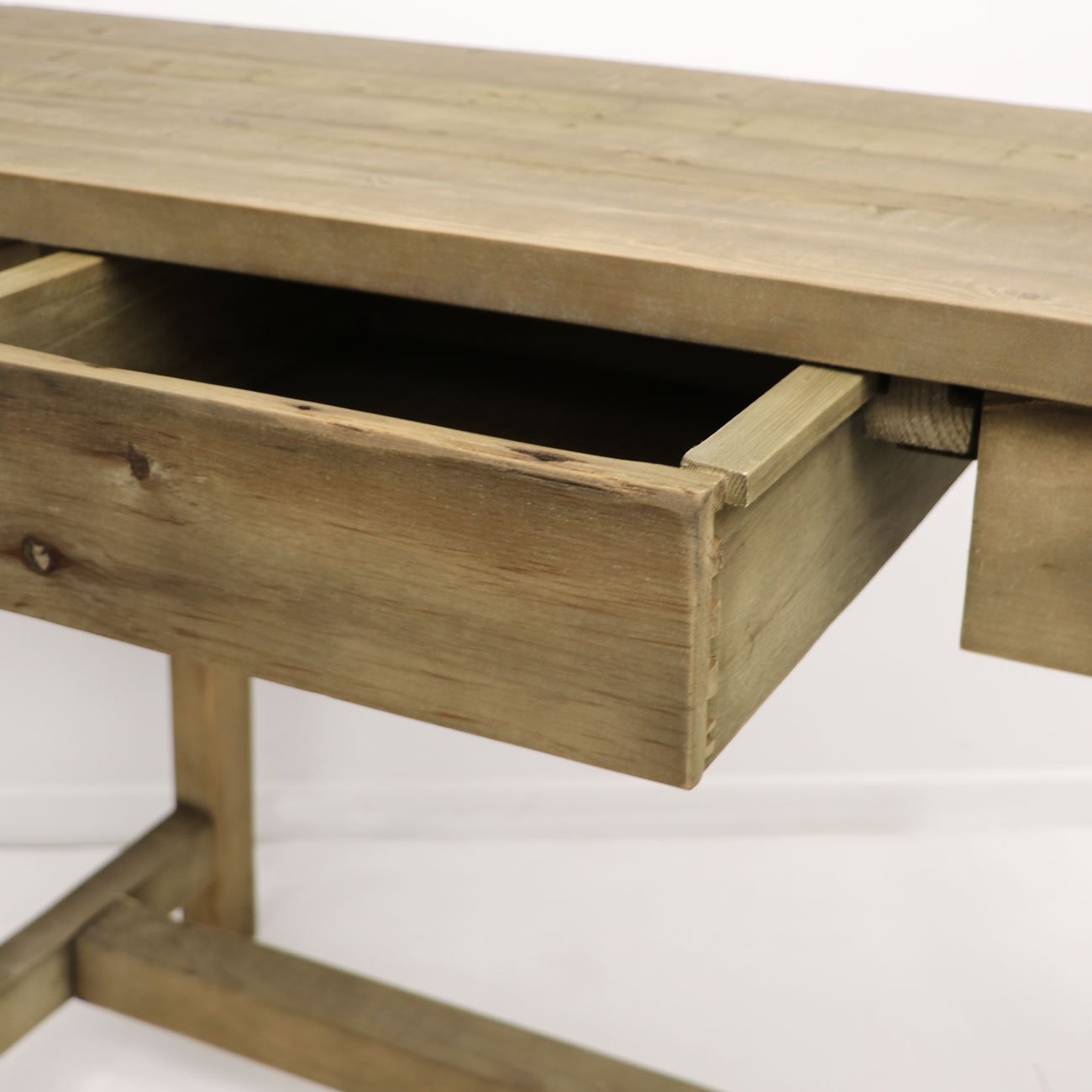 Industrial inspired, the Cresta console features two hand-less drawers and sits atop farmhouse style legs. Long and narrow, Cresta could also be utilised as a slimline laptop desk.