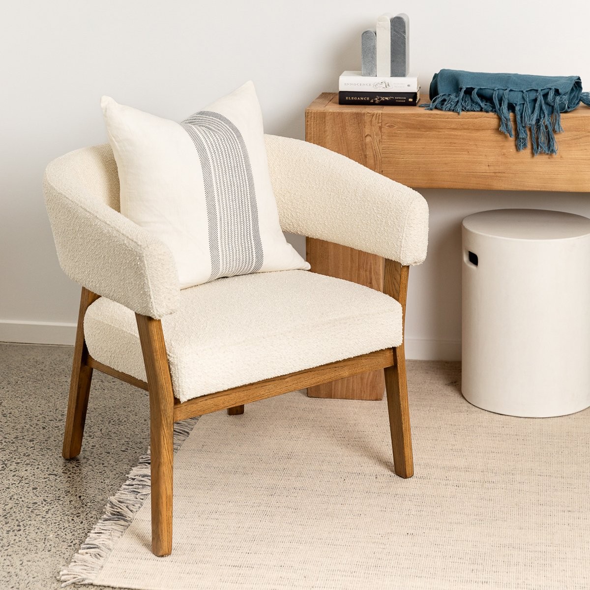 Take a seat and sit a while in the Tulsa armchair. Featuring an oak frame, Tulsa’s cream boucle fabric combined with the curved back shape creates both wrap-around support and snuggle factor. You will never want to get up!