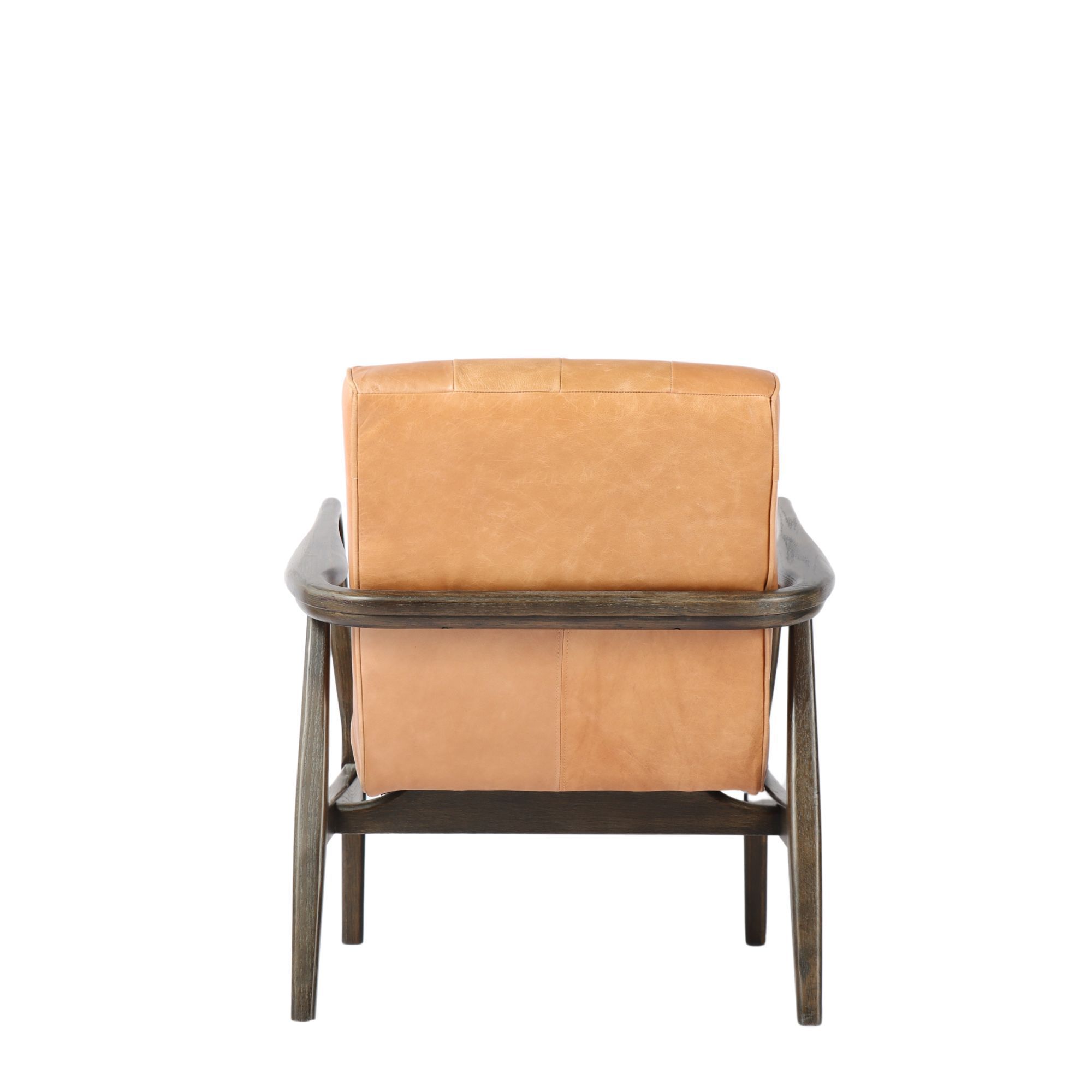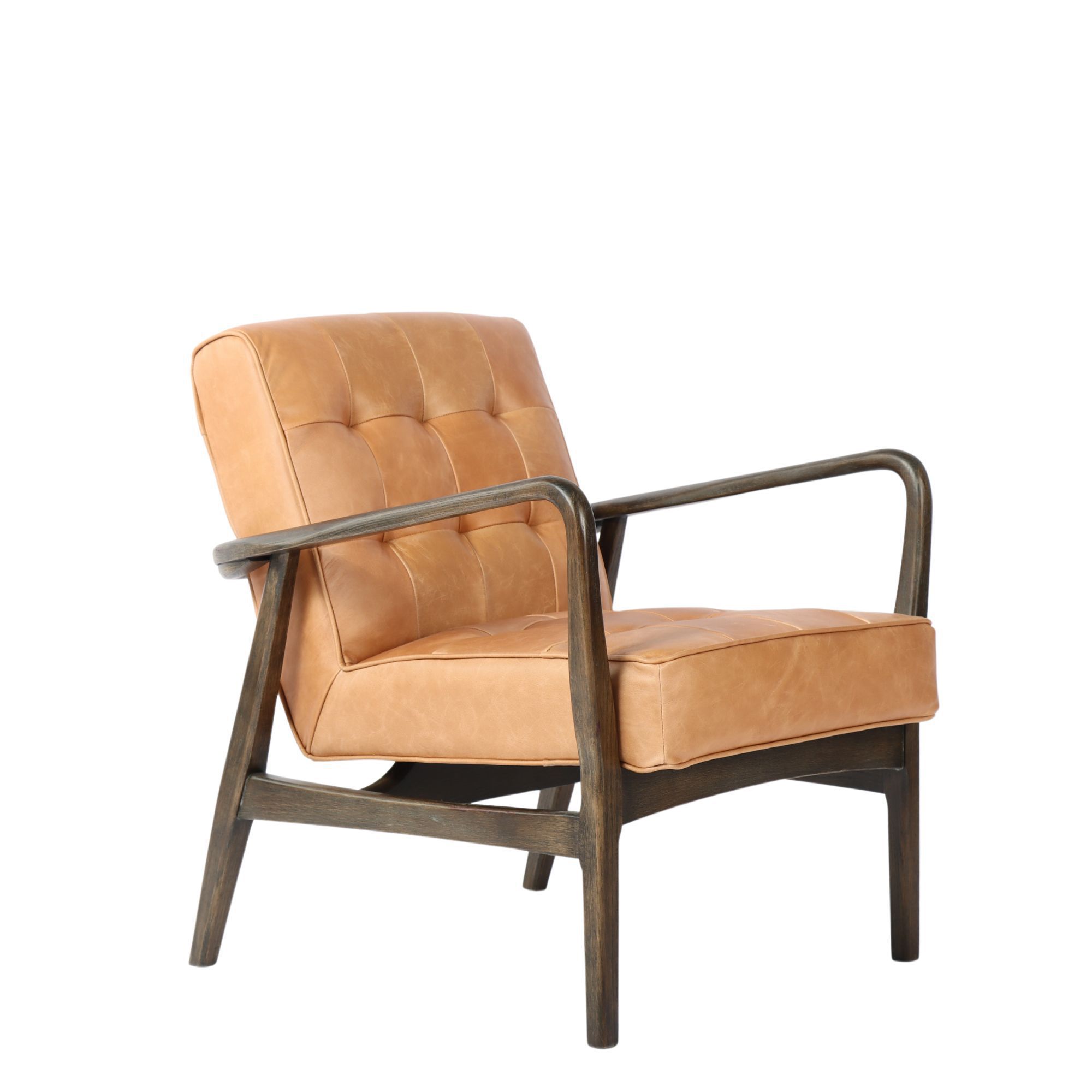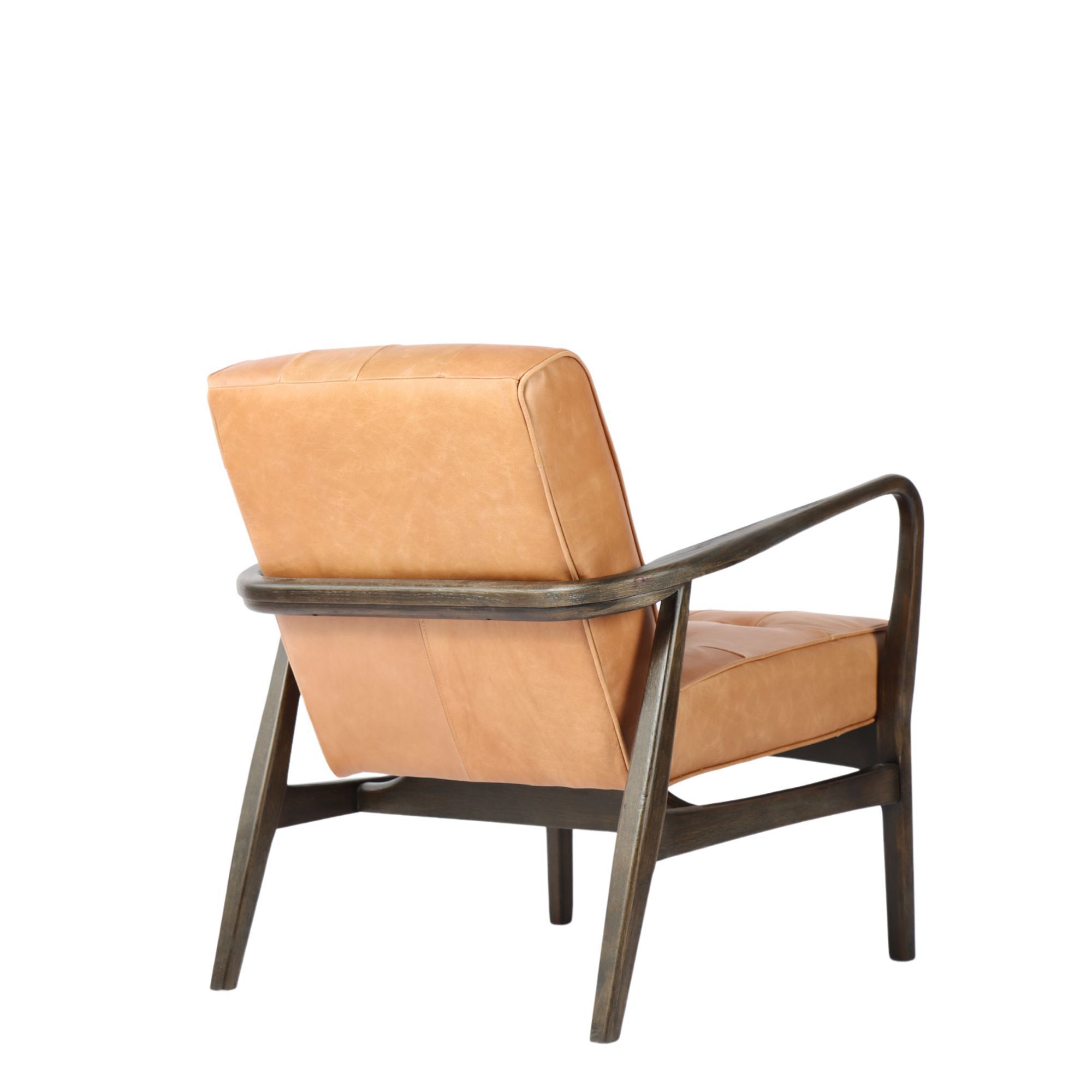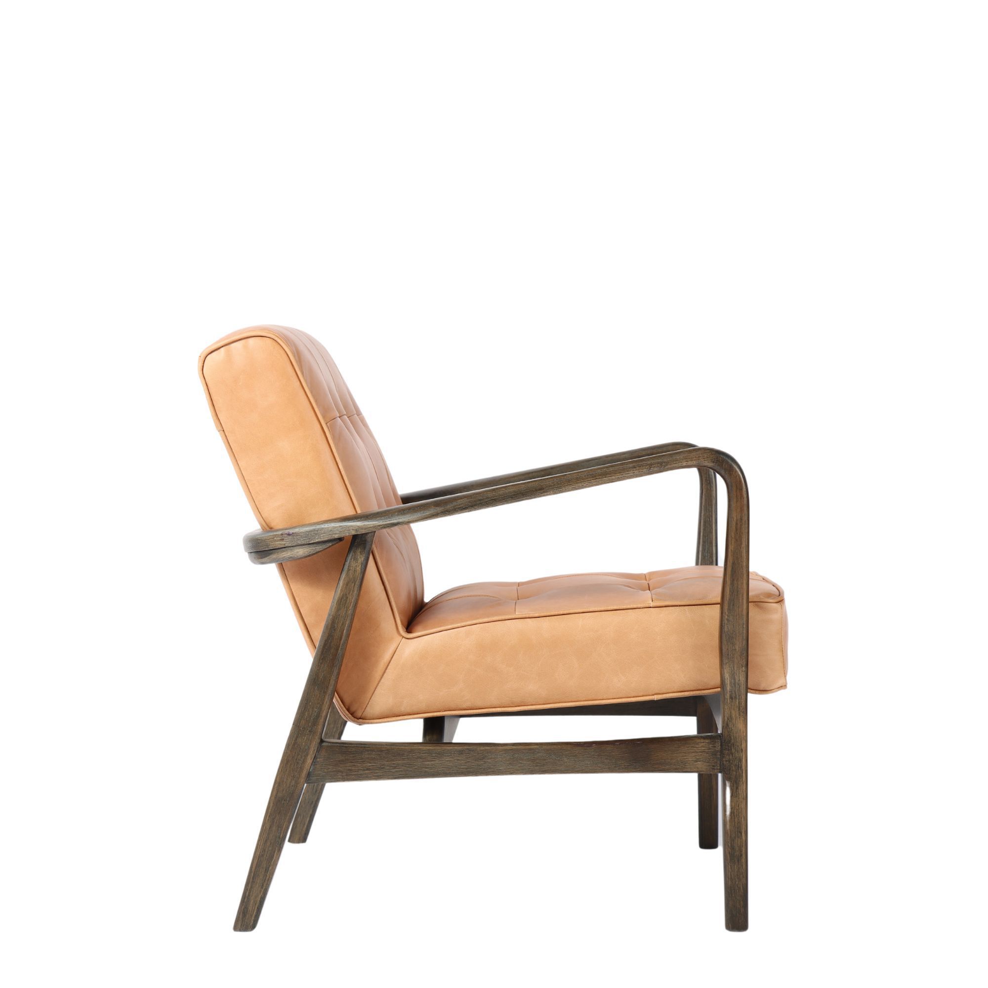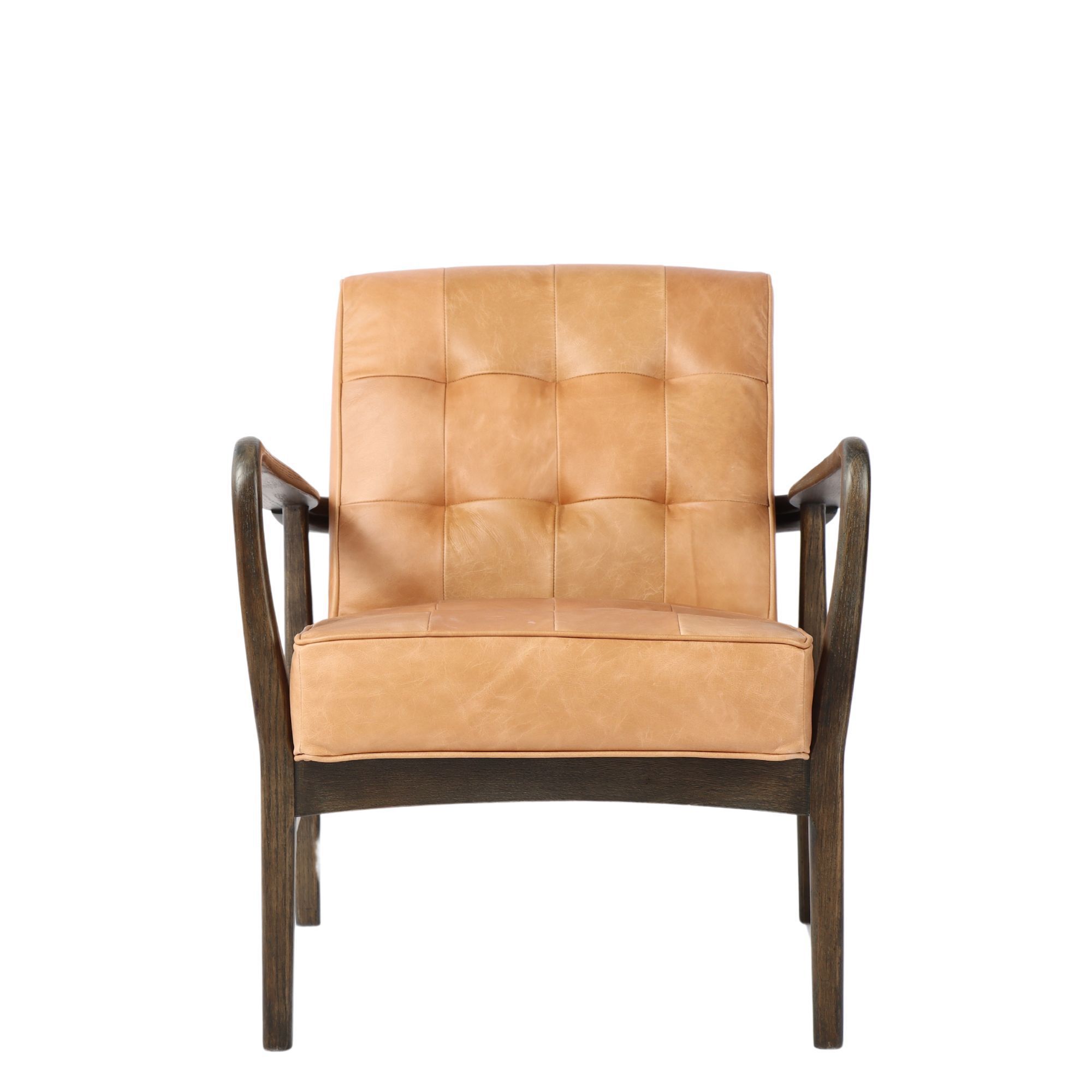 This stunning occasional chair make a real statement in any lounge setting. With its retro styling combining beautiful dark curved oak arms and top grain tan leather, it combines genuine comfort and style.